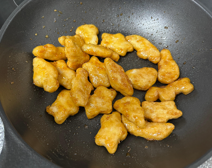 5. 불은 약불에 두고 휘휘 저어주며 치킨너겟이 양념을 머금고, 양념이 없어지면 불을 꺼주면 끝!