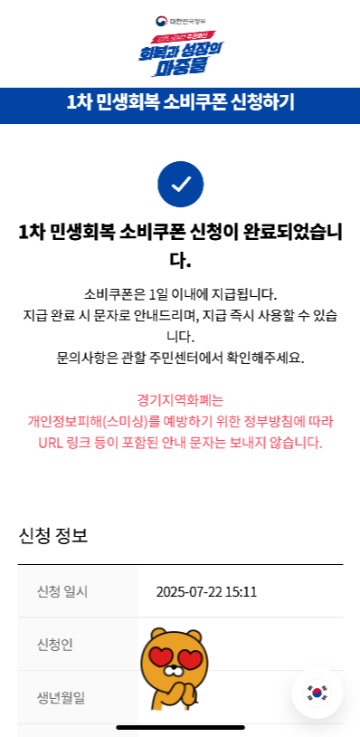 그리고 잠들어 있던 7월 23일 새벽 5시 7분, 민생회복 소비쿠폰 1차 금액이 지급 완료되었다는 카톡이 와있었어요. 10시에 지급된다고 적혀있었는데 엄청나게 빠른 지급에 깜짝 놀랐답니다.