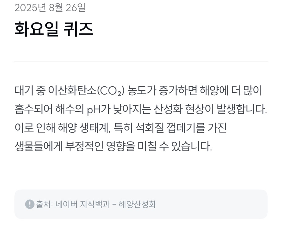 Q. 해양의 산성화는(Ocean Acidification)는 대기 중 이산화탄소(CO2) 농도가 감소하면서 발생하는 현상이다.