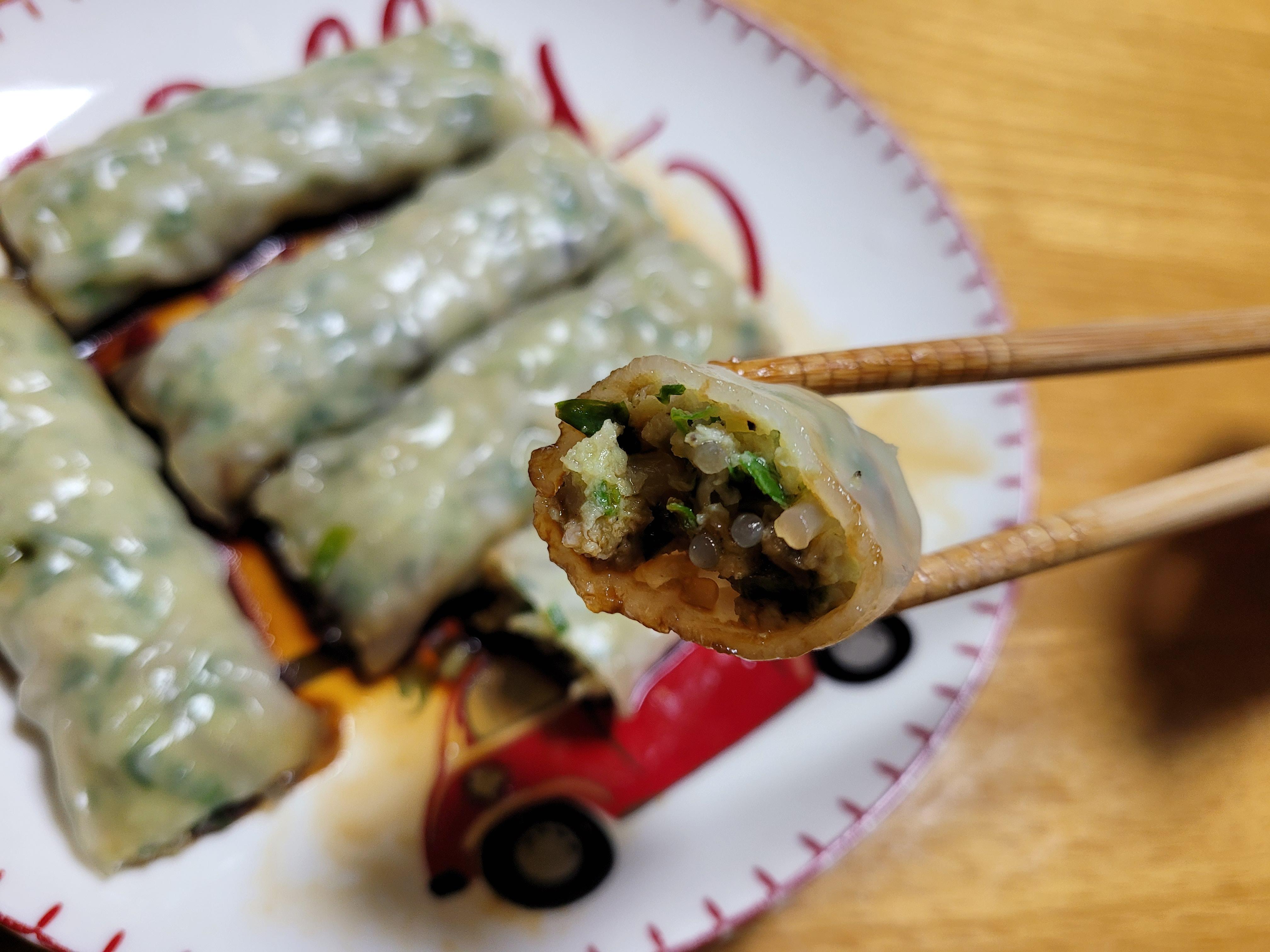 딤섬의 메뉴 중 한가지로 얇은 쌀피에 고기나 해산물 또는 야채를 넣어 돌돌 말아 푹 쪄서 간장에 찍어먹는 딤섬입니다.