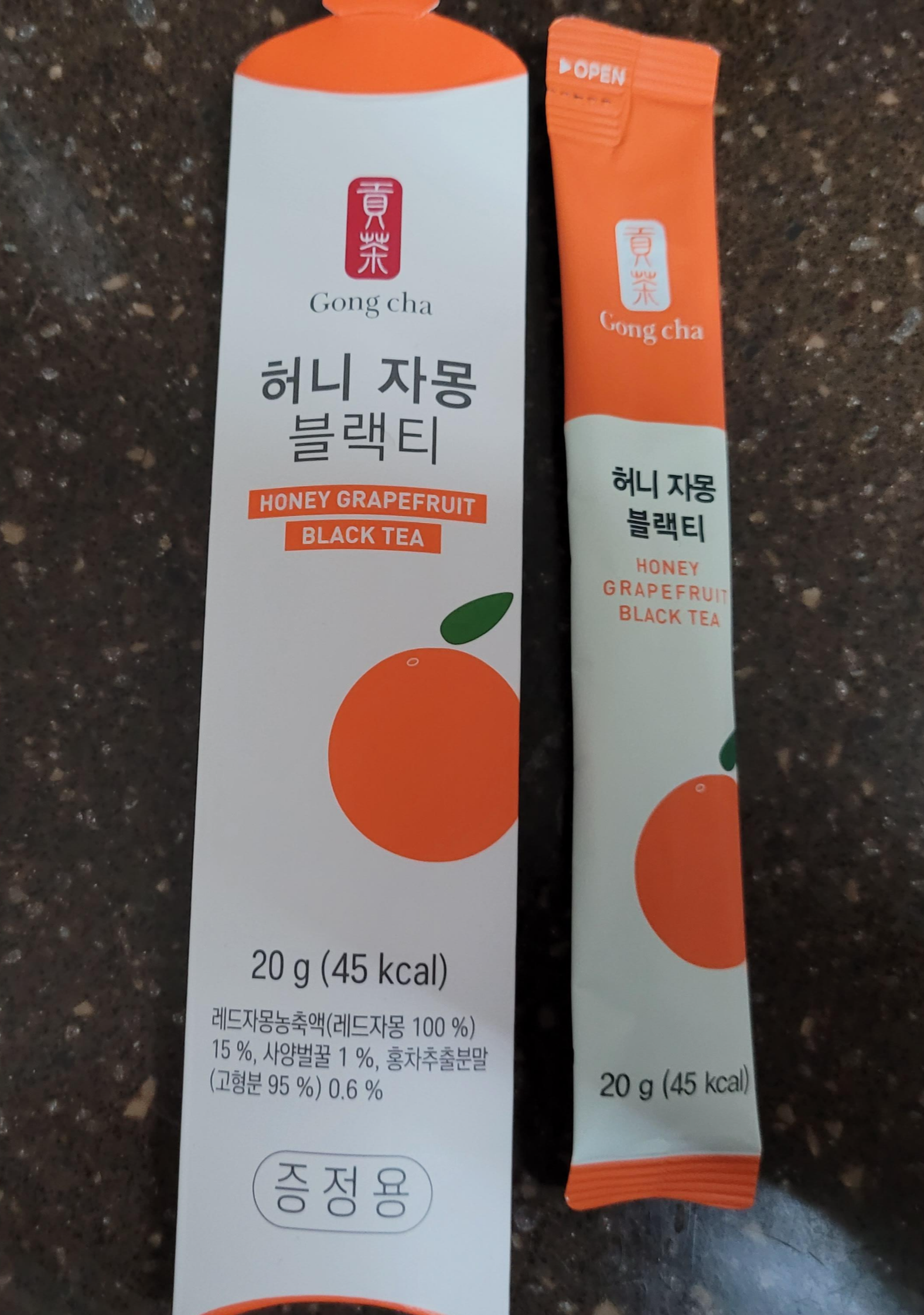 용량은 20g입니다. 그리고 허니자몽블랙티의 칼로리는 45 kcal입니다. 공차 홈페이지나 상품에도 카페인이 기재되어있진 않지만, 블랙티이기때문에 카페인이 들어있으니 아이들은 먹지 않도록 합니다.